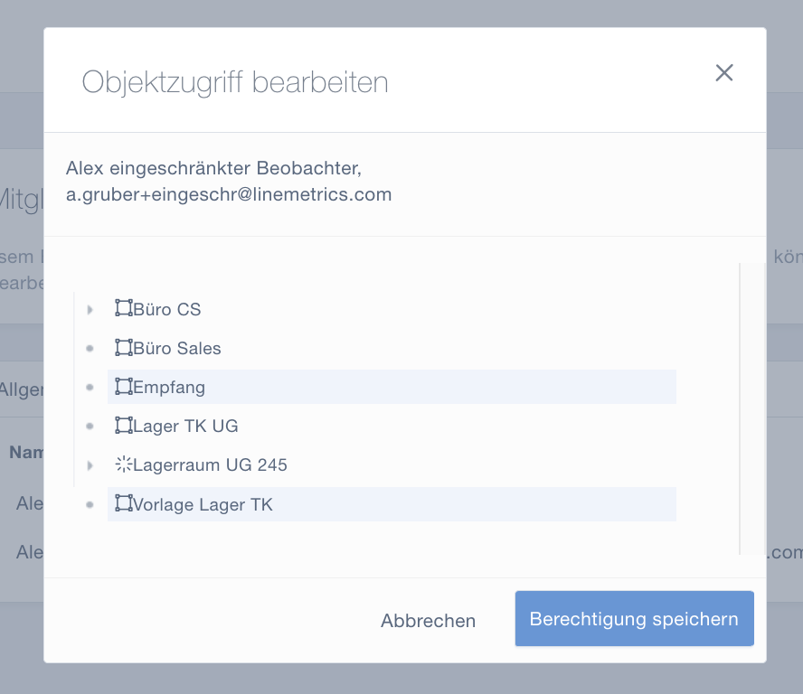 Für ein Mitglied eines Accounts mit der Rolle "eingeschränkter Beobachter" sind immer nur zugewiesene Objekte ersichtlich. Ein Administrator des Accounts kann diese zugewiesenen Objekte unter "Einstellungen" und "Mitgliederverwaltung" ändern bzw. weitere Objekte für dieses Mitglied freigeben.