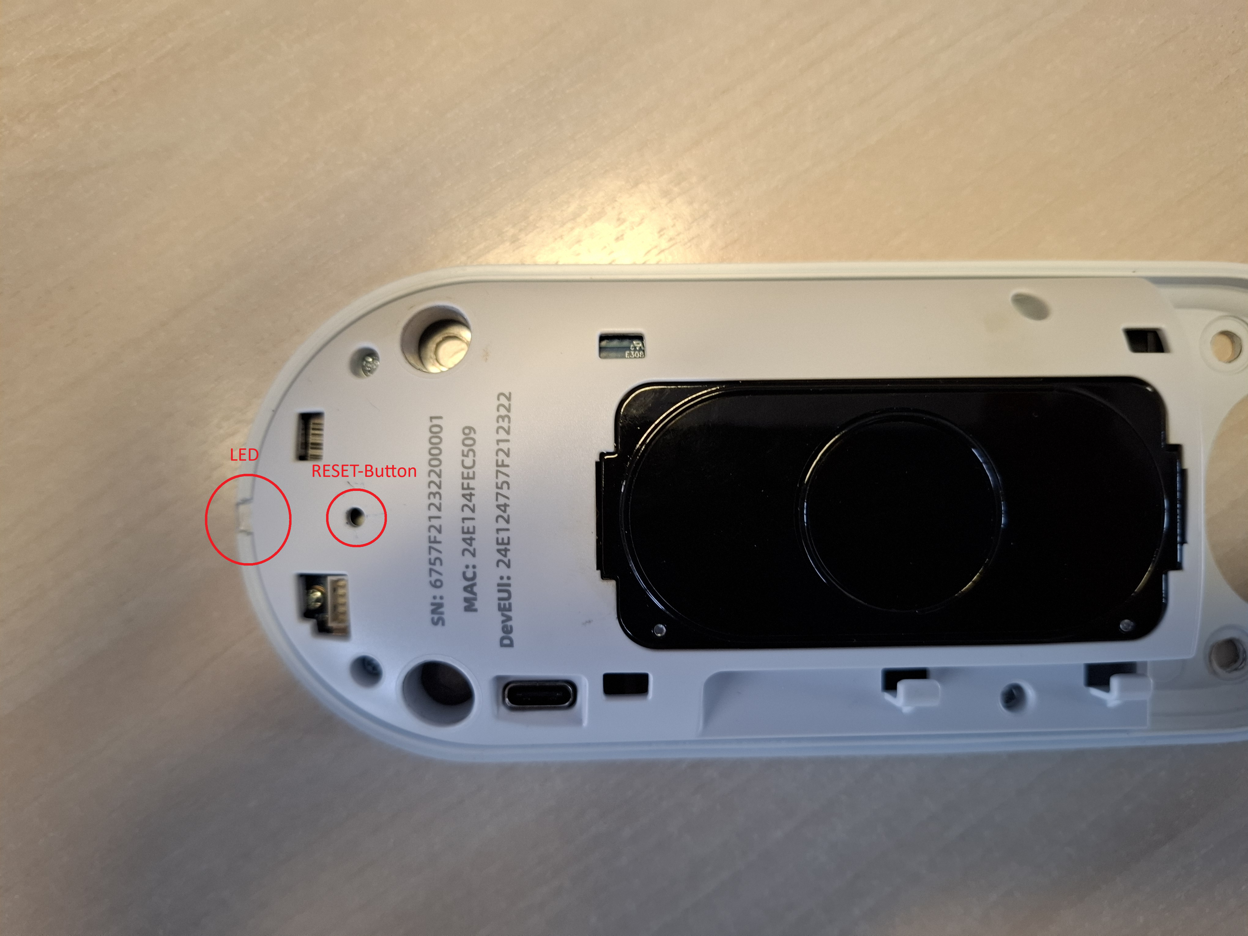 2) Nehmen Sie einen dünnen Schraubenzieher oder ein anderes dünnes Objekt und führen Sie in die am Foto markierte Öffnung ein. Sie sollten dann einen Button spüren. Halten Sie diesen mehr als 10 Sekunden gedrückt bis die Led draussen grün blinkt.